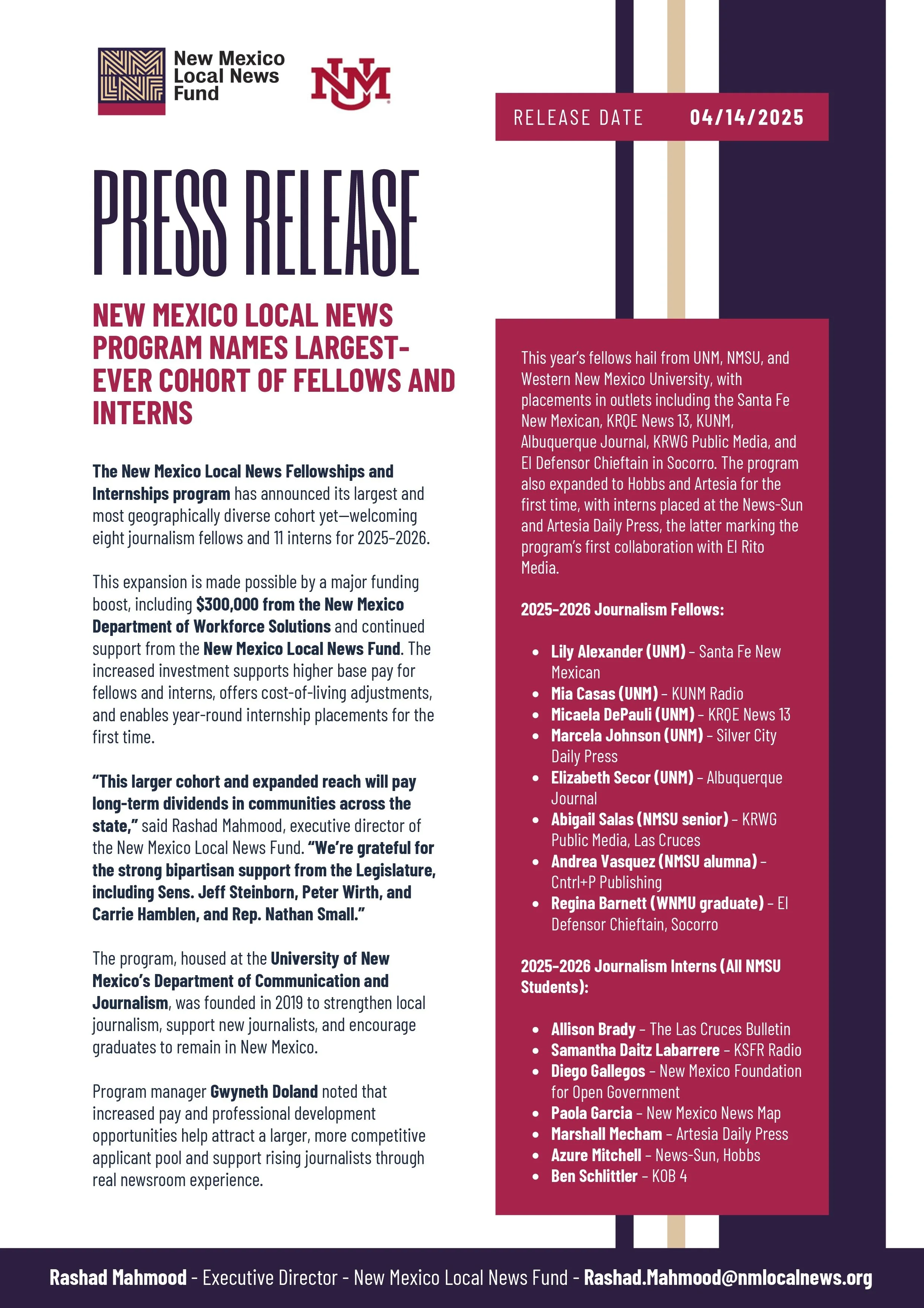 NM Local News Fellowships and Internships launches largest-ever cohort Apr 14 Written By NM Local News Fellowship NM Local News Fellowship